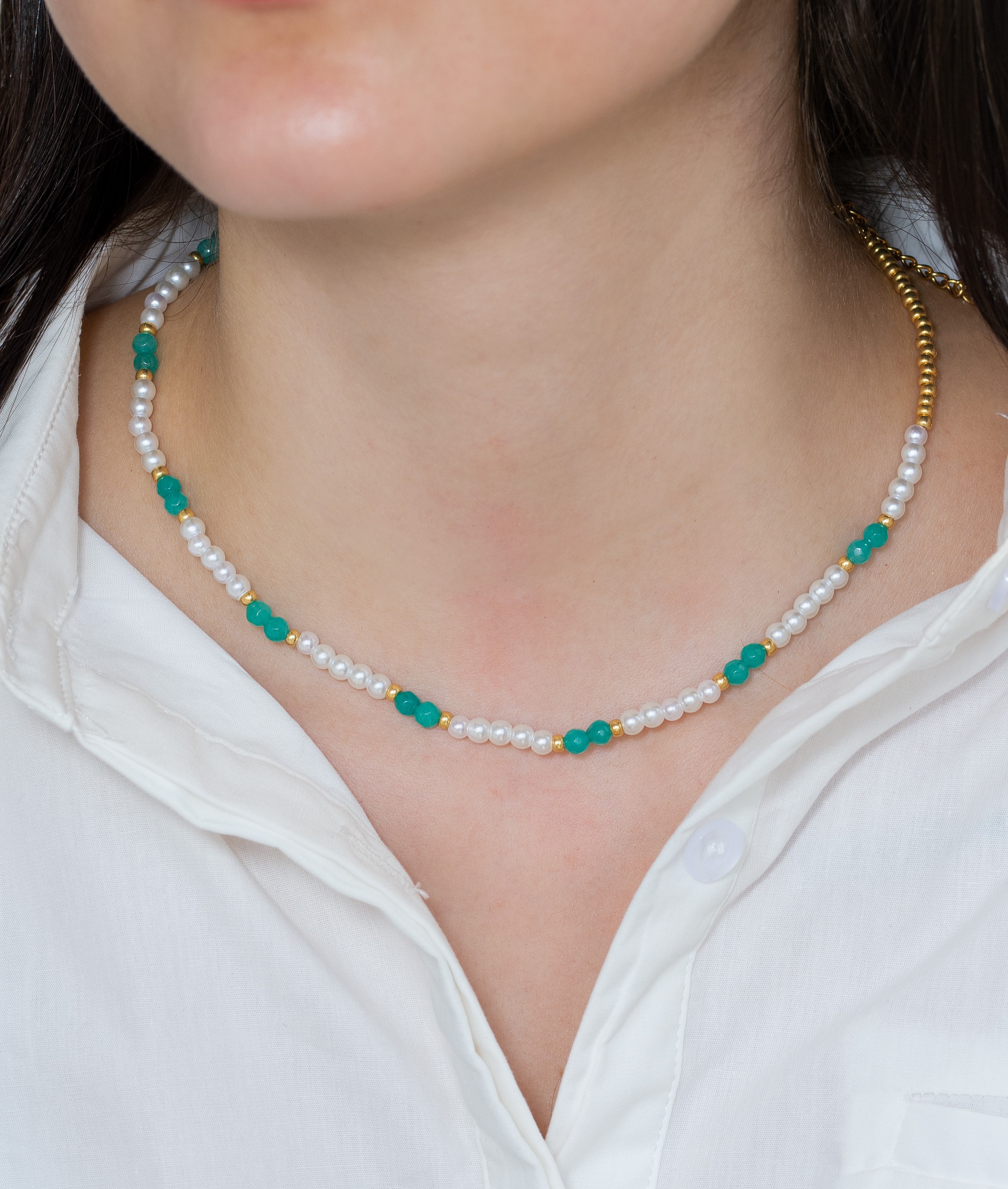 Un choker elaborado con pequeñas piedras naturales en tonalidades verde, complementado con perlas cultivadas.