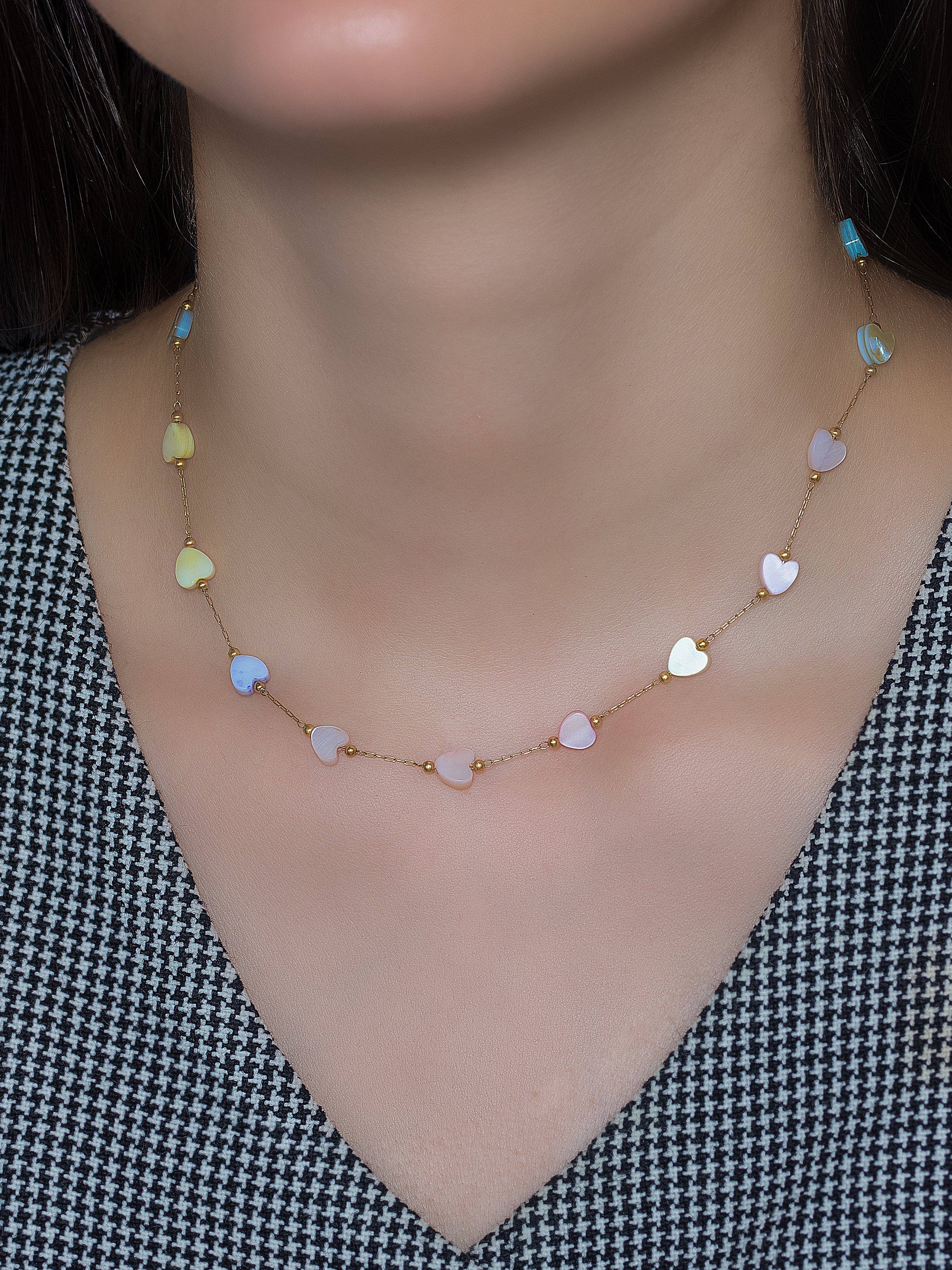 Collar de acero inoxidable, adornado con corazones de variados tonos.